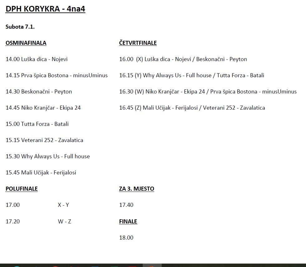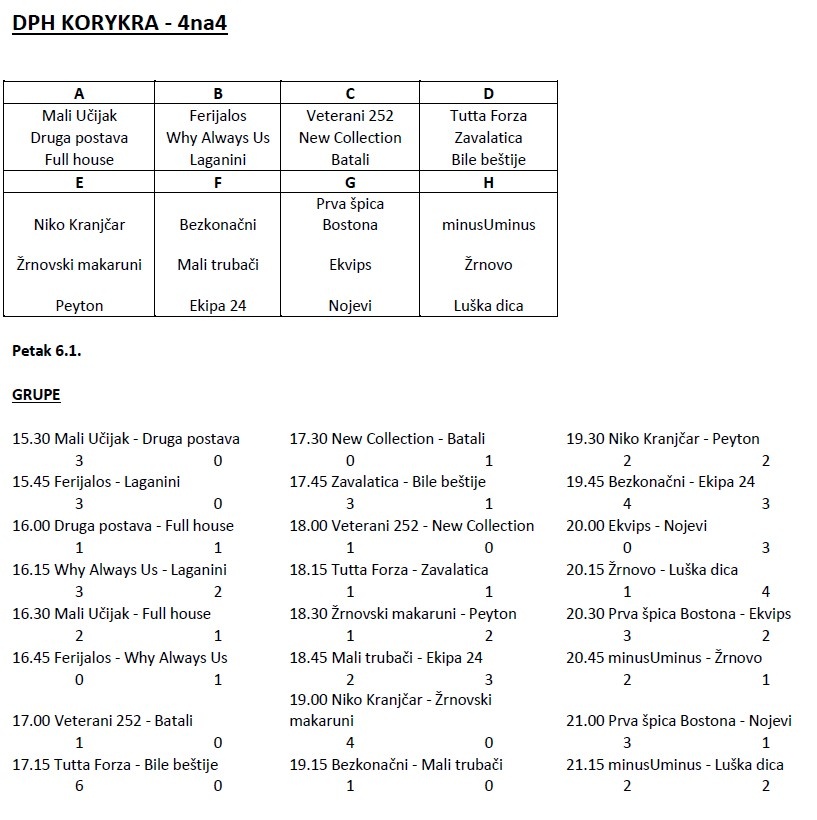 Sve rezultate sinoć odigranih 24 utakmice prvog dana turnira '4 na 4 ' koje organizira Društvo prijatelja Hajduka 'Korkyra' pogledajte u privitku u PDF-u.