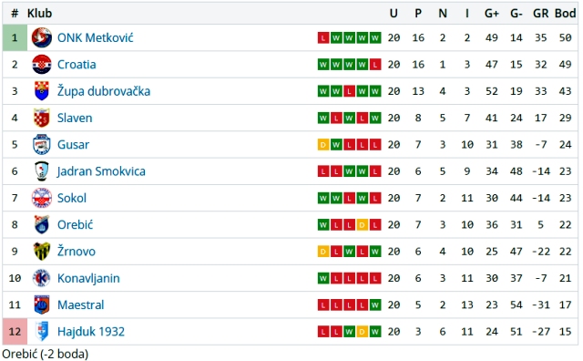 Rezultati 1.ŽNL-e 20. Kolo: Krvavac: Maestral - Orebić 3:1, Vela Luka: Hajduk 1932 - Gusar 4:0, Metković: ONK Metković - Croatia 1:0, Gruda: Slaven - Sokol 3:0