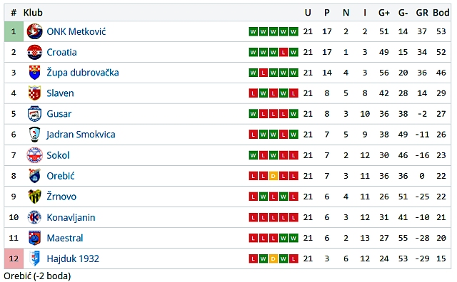 U ostalim utakmicama ONK Metković je pobjedom u kod Sokola kolo prije kraja zadržao vodeću poziciju bodom prednosti pred Croatiom. Župa dubrovačka je pa u slavila protiv Slavena.