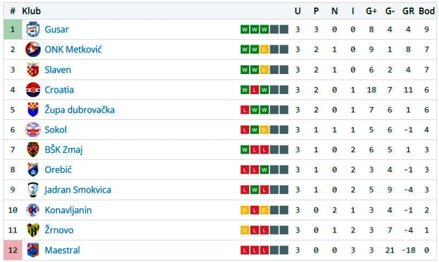 Rezultati 3.kola: Croatia – Jadran 6:3, ONK Metković – Slaven 1:1, Župa dubrovačka – Maestral 3:2, BŠK Zmaj – Orebić 1:2, Žrnovo – Gusar 1:2, Konavljanin – Sokol 1:1