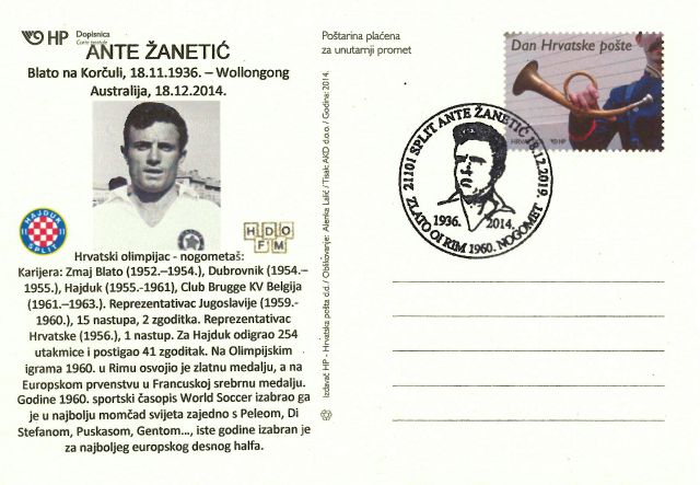 Povodom pet godina od smrti našeg legendarnog nogometaša Ante Žanetića, osvajača zlatne medalje na Olimpijskim igrama 1960., godine u Rimu, te srebrne medalje iste godine na Europskom prvenstvu u Franucskoj, HNK Hajduk, zajedno sa Hrvatskom poštom i Hrvatskim društvom olimpijske filatelije i memorabilije,